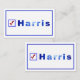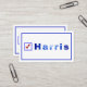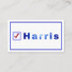 Ces cartes de visite électoraux de Vote for Harris arborent le nom du candidat à la présidentielle en bleu, à côté d'une case carré bleue avec un chèque rouge. Il y a une bordure bordée sur laquelle est bleu. La couleur arrière - plan est blanche. Le dessin est imprimé sur les deux côtés. Merci pour faire du shopping à CherylsArt sur Zazzle.