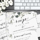 Une subtile faire-part de mariage blanche avec une aquarelle délicatement peinte de fleurs de pivoines blanches et de la végétation d'eucalyptus avec un duo de polices de calligraphie noir swashed pour cette RSVP en ligne.