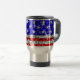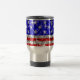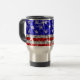 Design d'étoiles et de rayures avec des étoiles éparpillées sur un arrière - plan motif stylisé "à l'allure de paillettes". Tasse de voyage avec un design personnalisable rouge, blanc, gris argenté et bleu pour que vous personnalisiez avec votre propre texte, photos et idées. Veuillez noter qu'il s'agit d'une image d'art numérique imprimée, elle ne brille pas ou ne contient pas de parties scintillant ou de paillettes réelles.