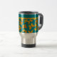 Une jolie Mug Voyage avec un motif de Papillons dorés, peinte à la main en aquarelle par Judy Adamson, sur un arrière - plan turquoise, avec une bande de couleur claire au sommet, que vous pouvez personnaliser ou laisser uni.
