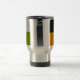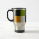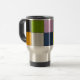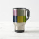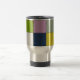 A stainless steel travel mug with a modern geometric patchwork design in bold colors. Featuring shades of black, green, pink, orange, gray, and blue, this artistic mug combines functionality with style. Perfect for coffee lovers, commuters, or anyone who enjoys carrying their drinks in a creative accessory.