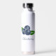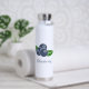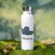 Une Bouteille isotherme avec un dessin de brimbelles ou myrtilles et ses feuilles vertes : une bonne idée pour prendre une boisson chaude ou froide au travail ou en randonnée. Le texte est personnalisable !