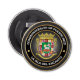L'emblème national de Porto Rico est au centre d'un design circulaire. La couleur arrière - plan est un dégradé radial noir/blanc, et autour des jantes des cercles, est une couleur fausse or. Le texte sur le dessin comporte le titre officiel de Porto Rico, tandis que le texte du bas est la devise, qui se traduit par l'île d'Enchantement.