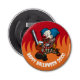 A crazy clown on a round bottle opener for Halloween. Use "Personalize this template" to change the " HAPPY HALLOWEEN 20XX!" text & year and create a unique, customized item. Featuring a colourful, manic clown wielding an orange chainsaw; with wild blue hair and wearing a ruff, massive clown shoes and stripy leggings and sleeves.