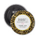 Ouvre-bouteille de remerciement pour enterrement de vie de jeune fille ou autre événement avec un motif élégant. Taches de léopard noir exotique sur fond doré. Style sauvage et élégant. Superposé sur le dessus est un cadre circulaire blanc avec une bordure en faux or, avec votre texte personnalisé à l'intérieur.