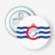 Button bottle opener with flag of city of Cincinnati, Ohio; white flag with three blue waves with red “C” in the center