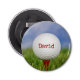 Gros plan de balle de golf sur tee rouge en herbe verte avec nom customisé. Le nom de la balle de golf peut être modifié.