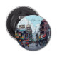 Illustration du centre-ville de Calcutta, architecture indienne, motos et voitures. Un ouvre-bouteille avec une illustration de la rue animée du centre-ville avec des immeubles, des restaurants, des magasins et des gens sur leurs motos.