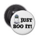 Juste Boo It1 en lettrage noir drôle qui a des yeux sur le dessus de certaines des lettres. À gauche des lettres se trouve un fantôme blanc avec des ombres violettes et des trous verts ovaux éffrayants pour les yeux. Amusant pour un petit régal d'Halloween.