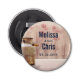 Ouvrages de bouteilles sur le thème rustique de la campagne. Un vieux lait rouillé peut avec une jolie fleur d'orange à côté. Blé et pavots rouges estampillés dans l'arrière - plan dressés contre un panneau en bois. Personnalisez avec les noms du couple mariage et la date du mariage.
