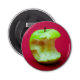 Photo d'une grosse pomme verte against red background. The big bite has been taken out of the apple.