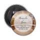 Mariage merci les ouvre-bouteilles avec une photo pittoresque. Un pont en bois qui mène à un chemin entouré d'arbres forestiers qui changent de couleur. Couché sur le dessus est un cercle semi-transparent avec une bordure en or, votre texte personnalisé à l'intérieur.