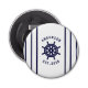 Cet ouvre-bouteille nautique a un Nom de famille et l'année de la personnalisation. Choisissez "personnaliser ce modèle" pour écrire le nom de famille est. année. L'ouvre-bouteille maritime est décoré de rayures bleu marine et blanc et d'une roue de bateau. C'est une belle idée pour une maison de plage, cuisine de style nautique, bateau familial ou yacht, etc.