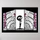 Cette fabuleuse composition est un regard intéressant sur un classique art déco, une beauté balnéaire avec un parasol en silhouette. Elle est flanquée de part et d'autre de ventilateurs rampants et de petits tourbillons avec des fleurs de style déco sur les marges gauche et droite. Décoré en noir avec un arrière - plan blanc, accentué de fleurs en rose et violet.