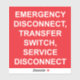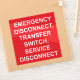 Un étiquette autocollant DISCONNECT D'URGENCE, COMMUTATEUR DE TRANSFERT, SERVICE DISCONNECT à utiliser par les électriciens pour satisfaire aux exigences de l'article 230.85(E)(1) et (2) du Code national de l'électricité de 2023.