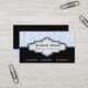Carte de visite aux intérieurs damassés de bleu noir, avec motifs damassés de bleu et blanc. La partie inférieure est de couleur noire solide. Une bande noire et une bande bleue séparent les deux parties. Votre entreprise/nom est tapé sur un élégant étiquette damassé aux contours noir et bleu.