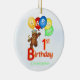 Jouer ours royal en peluche portant une couronne princière de bijoux bleus, jaunes, rouges et verts tenant un tableau coloré de ballons et dansant sur l'anniversaire B est un joyeux ornement de gardien 1er anniversaire pour un garçon. Personnaliser l'ornement avec le nom du garçon d'anniversaire le rend spécial. Le nom, l'année et le texte peuvent être personnalisés à l'aide du modèle fourni.