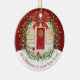 Pour fêter le premier Noël d'un couple dans sa Nouvelle Maison. Ce joli ornement en céramique a une illustration d'une porte rouge assise au centre d'une jolie couronne sainte. Des lumières chaudes brillent dans les fenêtres des deux côtés de la porte et deux cambrioleurs s'assoient sur les feuilles saints. Une grande illustration de l'arc rouge juste au-dessus de la porte finit ce design élégant. L'arrière de l'ornement est rouge et a la même couronne sainte et les mêmes robins. Le centre est laissé en blanc pour votre message personnel ou les noms du couple. Un beau souvenir d'un premier Noël de nouvelle maison.