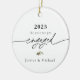 Each ornament is printed in high quality on ceramic with a gold string for hanging — perfect for Christmas trees, engagement gifts, or newly engaged couples celebrating their first holiday together.