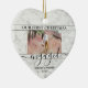 Célébrez le 1er jour férié de votre fiançailles avec une photo personnalisée en forme de coeur 2 "Our First Christmas Engaged" en faux marbre céramique ornement. Tous les textes et images de ce modèle sont simples à personnaliser. (CONSEIL EN MATIÈRE DE PLACEMENT D'IMAGE : Une façon simple de centrer une photo exactement comment vous voulez est de la rogner avant de la télécharger sur le site Zazzle.) En tant qu'idée, la typographie de script peut lire "Ensemble" ou "Marié". Design propose une bordure en faux marbre noir et blanc, une calligraphie de style manuscrit, les noms et l'année du couple et deux photos de votre choix. Cette tenue mariage unique ajoute une touche élégante à la décoration de la maison de Noël.