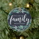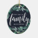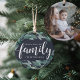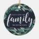 Célébrez ce qui compte le plus avec ce doux ornement personnalisé avec les mots "Paix, Amour, Joie, Famille" ainsi que votre nom de famille et l'année, orné de feuilles d'hiver couleur verte et feuillage. Personnalisez le dos avec une photo préférée.