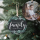 Célébrez ce qui compte le plus avec ce doux ornement personnalisé avec les mots "Paix, Amour, Joie, Famille" ainsi que votre nom de famille et l'année, orné de feuilles d'hiver couleur verte et feuillage. Personnalisez le dos avec une photo préférée.
