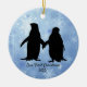 Parfait pour votre premier Noël ensemble ou votre dixième. Cet ornement a un adorable couple de silhouettes de manchots tenant la main sur un arrière - plan d'hiver avec des flocons de neige.
