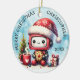 Créez un ornement personnalisé unique avec les salutations Joyeux Noël et un robot mignon portant un chapeau de Père Noël, tenant un biscuit, assis près d'un arbre de Noël, une tasse de cacao chaud et une boîte cadeau. Ce design est sur un arrière - plan bleu pastel enneigé avec des flocons de neige blancs. C'est une idée amusante pour une tenue de Noël pour les enfants et tous ceux qui aiment les robots. Le modèle vous permet d'ajouter facilement votre nom et de taper un an.