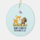 Un ornement de naissance de bébé avec une jolie illustration représentant un cerf de bébé et un petit écureuil tenant un cordon et un papillon volant au-dessus de leur tête. Ces adorables créatures boisées se tiennent debout sur une herbe avec quelques champignons fantaisistes à leurs pieds. Arrière - plan bleu clair.