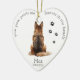 Aquarelle Mémorial pour animaux de compagnie Berger allemand ornement en céramique de Noël. Cherchez la mémoire de votre bien-aimé berger allemand avec notre ornement en céramique de Noël en forme de coeur. Le devant comporte un message émouvant, "Vos empreintes de pattes sont éternellement dans nos coeurs", avec de l'espace pour ajouter le nom de votre chien et leurs dates de naissance et de passage, et une belle aquarelle d'un berger allemand et des empreintes de pattes rendent cet ornement encore plus spécial. Vous pouvez également ajouter une photo chère de votre ami furry. Gardez leur mémoire vivante pendant la période des fêtes et au-delà. Créez un hommage chaleureux à votre fidèle compagnon. Customisez votre ornement maintenant pour honorer la mémoire de votre berger allemand avec amour et souvenir.