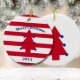 Changez vos souhaits de Noël avec ce design moderne de Noël. Toujours en utilisant les couleurs saisonnières traditionnelles, ce design utilise le rouge blanc et bleu. L'arbre rouge a des décorations suspendues. Salutation de Noël moderne et simple.