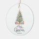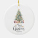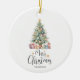 Célébrez la saison avec cet élégant ornement de Noël avec un magnifique aquarelle peint à la main et entouré de cadeaux festifs et de l'accueil classique "Joyeux Noël". Ajoutez votre nom ou votre nom de famille pour en faire le vôtre. Parfait pour décorer votre arbre, donner à ceux qui vous sont chers, ou commémorer une saison de fêtes spéciale.