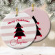 Changez vos souhaits de Noël avec ce design moderne de Noël. Toujours en utilisant les couleurs saisonnières traditionnelles, ce design utilise le rose et le noir. L'arbre noir a des décorations rouges. Salutation de Noël moderne et simple.