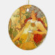 Ornement présentant la lithographie en couleur Automne (1896) d'Alphonse Mucha. Une jolie femme aux cheveux roux vêtue d'une robe blanche tient une récolte de raisins dans une main et un bol dans l'autre. Une couronne de fleurs blanches orne sa tête. Un cadeau fabuleux pour les amateurs d'Art nouveau et les collectionneurs d'art tchèque.