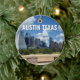 Cet ornement souvenir souvenir moderne d'Austin Texas présente un ciel bleu magnifique et des nuages au-dessus de l'horizon de la ville. Tous les nouveaux bâtiments contre les beaux arbres verts qui incarnent la beauté du centre-ville urbain et la nature des lieux. Un cadeau de séjour idéal pour un visiteur ou une Austinite locale qui aime explorer Butler Park, Liz Carpenter splash pad, et Auditorium Shores.