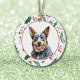 On the front of this Holiday ornament is a beautiful watercolor portrait of an Australian Cattle Dog. The portrait is placed within a pretty green holly leaf and red berry pattern circular frame. The back of the ornament has the same background and circle with your custom text in matching red and green.