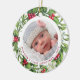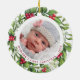 Décorez votre arbre ou offrez un cadeau spécial cette saison de vacances avec cette élégante photo de bébé dans un ornement de Noël design de couronne, et décoration assortie. Ce bijou de Noël de bébé est doté d'une couronne d'aquarelle verte et rouge avec houx et baies. Personnalisez avec nom et année. Ce premier ornement de Noël peut être personnalisé pour maman et papa, grands-parents, chien et animaux domestiques. Visitez notre collection pour obtenir des cartes de noël, des décors et des cadeaux assortis. DROIT D'AUTEUR © 2020 Judy Burrows, Black Dog Art - Tous droits réservés. Baby First Christmas Personnaliser 2 Photo Mistletoe Ornement en céramique