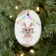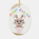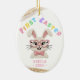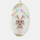 Celebrate a precious milestone with this adorable 'First Easter' ornament, perfect for your little one's special day! Featuring a charming knitted-texture bunny wearing stylish pink heart-shaped glasses and a cute bow tie, this design radiates sweetness and joy. The vibrant 'FIRST EASTER' text in pastel colors adds a playful touch. Personalize it with your baby's name to create a unique keepsake.