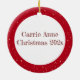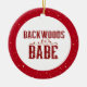 Amusez-vous dans une tasse en latte pour ceux qui vivent à la campagne. "Backwoods Babe" texte rouge foncé en détresse avec fancy fleurish sur rouge et or étoiles arrière - plan. Personnaliser l'ornement sur le dos avec nom ou monogramme