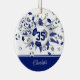 L'ornement de cette jeune fille cool est doté d'une "explosion" de balles de football de tailles variées qui ont des panneaux bleus, gris et blancs, et des formes d'étoiles grises et bleues, sur laquelle vous pouvez personnaliser son numéro de maillot - l'étoile bleue a un tout petit motif de pois blancs - customiser le nom de l'athlète sur le devant et année commémorative sur une bande de couleur bleue au fond de l'ornement ament - katz_d_zynes