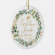 Baptême bébé ornement photo - Ce design présente une illustration de feuillage vert et doré, baies rouges en aquarelle. À l'envers - vous pouvez placer votre photo