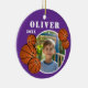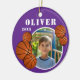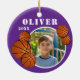 Boule de basket-ball violet personnalisé Sport photo ornement en céramique. Ornement avec boules de basket, un nom personnalisé et une photo dans un cadre rond.