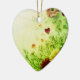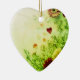 Flowers are on the front and more flowers are on the back of a heart-shaped ceramic Valentine tree ornament.