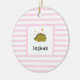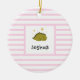 Élégant, moderne et mignon ornement photo de bébé rond ornement sur le motif à rayures rose bébé. Ce modèle présente une adorable illustration de dinosaure bébé vert dormant sous les étoiles jaunes dorées avec le nom de bébé personnalisé. Idéal pour le bébé garçon et la fille. Un cadeau parfait pour toutes les saisons !