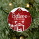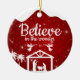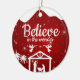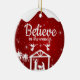 Believe in the wonder, Religious Holiday Ceramic Ornament with berry red sparkle glistening glow Nativity Scene capturing the Christmas magic and joy of a Christian season. On the back, the sacred writing, Luke 2:12 states, "And this shall be a sign unto you; Ye shall find the babe wrapped in swaddling clothes, lying in a manger" all in customizable text, ready for you create your favorite bible verse in festive devotional design hanging decorations. Order your Christ teachings testaments today and make your custom inspirational doctrine keepsakes extra special with divine passages of the word of our Lord! 🎄⛪️