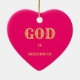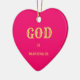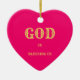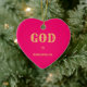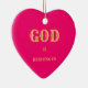 Ornement de cœur de bénédictions de Noël significatif avec le texte Dieu nous bénit sur fond rouge magenta. Le texte qui nous bénit peut être personnalisé. Comptez vos bénédictions !