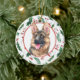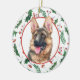 A l'avant de cet ornement de vacances se trouve un beau portrait d'un Berger Allemand. Le portrait est placé dans un cadre circulaire en motif de baies rouges et feuilles vertes. Le dos de l'ornement a le même arrière - plan et cercle avec votre texte personnalisé en rouge et vert assortis.