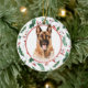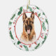 Sur le devant de cet ornement de vacances est un beau portrait aquarelle d'un Chien berger allemand. Le portrait est placé dans un cadre circulaire en motif de baies rouges et feuilles vertes. Le dos de l'ornement a le même arrière - plan et cercle avec votre texte personnalisé en rouge et vert assortis.