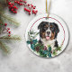 A l'avant de cet ornement de vacances se trouve un beau portrait d'un majestueux chien de montagne bernois qui regarde d'un chandail saint et à feuillage persistant. Les baies rouges et les cônes de pin ornent les sprigs de houx et de pin. L'image est placée sur un cercle blanc à l'intérieur d'un cercle mince de ligne rouge. L'arrière de l'ornement a la même couronne à feuillage persistant et rond avec votre texte personnalisé en rouge.