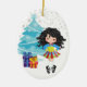 Cet adorable ornement de Noël à thème de danse irlandaise présente une jolie danseuse irlandaise aux cheveux noirs dans une robe bleu, rouge et vert en solo dansant dans un pays merveilleux d'hiver avec de la neige, un arbre de Noël et des cadeaux. Personnalisez le dos de l'ornement avec un nom et une année!